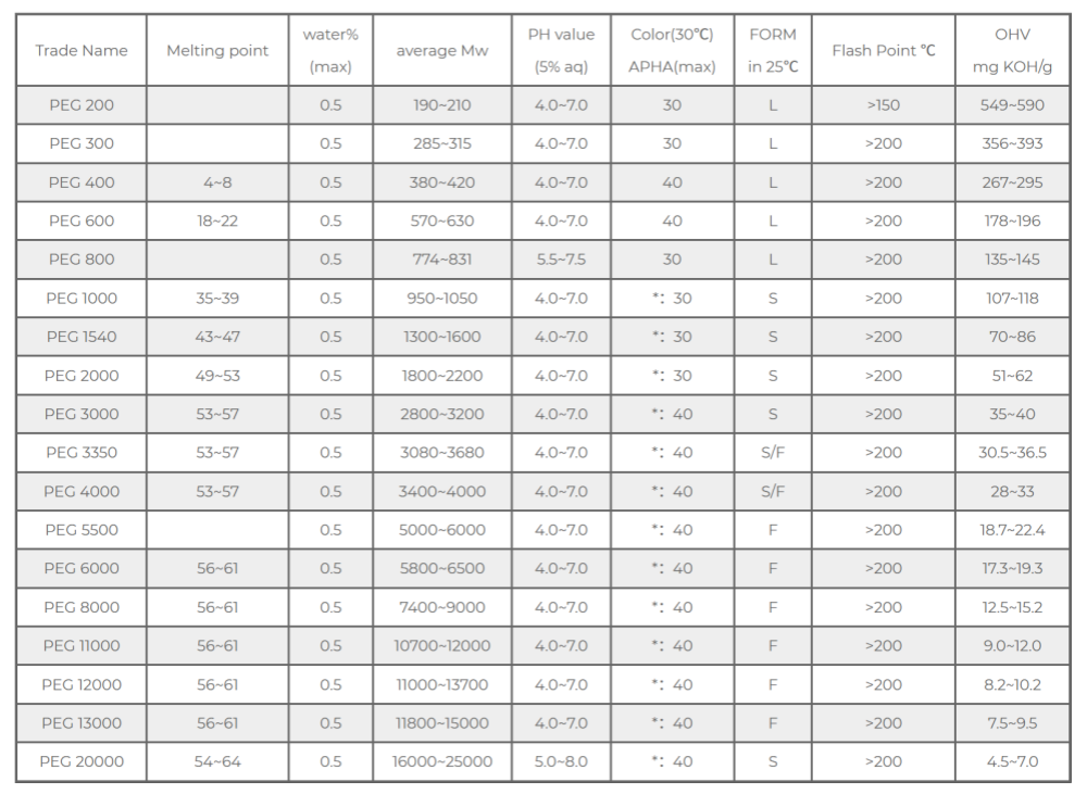 PEG-1000 bis PEG-4000: Wachsartige Feststoffe mit mittlerem Molekulargewicht. Mit steigendem Molekulargewicht steigen auch die Viskosität und der Schmelzpunkt. PEG-3350 ist beispielsweise eine häufig verwendete Zäpfchen- und Salbengrundlage in Arzneimitteln und bietet eine gute Formbarkeit und Wirkstofffreisetzungsleistung.